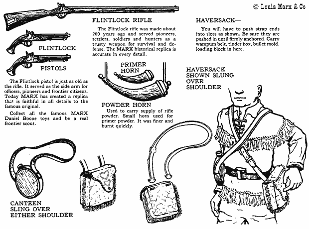 Equipment ManualDaniel Boone grew up a hunter and woodsman in Pennsylvania and North Carolina. When he was a young man his mind was stirred by reports of the great wilderness that lay West of the Appalachian Mountains with its untouched forests, boundless game and great rivers. So in 1768 Daniel left his wife and three children and went into the wilderness with his brothers and a few friends. Although his brothers and friends went back to their town after a while, Daniel lived in the forests for two years, hunting, trapping and exploring. He had encounters with bears, storms and hostile Indians. After he left the wilderness he went back to North Carolina and brought his family, his friends and his neighbors with him back into the wilderness to settle down and live. For many years Daniel helped found towns and defend them from the Indians. Because he was brave and strong he kept the wilderness free of Indians and British Troops during the American Revolution. When peace finally came, though, Daniel couldn't keep still. He wanted to roam in the wilderness, not sit still in a town. At 65 years of age he moved further West to Missouri. Upon leaving the Kentucky wilderness people asked him why he was moving on at his age. He said, "Too crowded here! I want more elbow room." In Missouri He was treated as a great man, and he hardly had time for hunting and exploring. He continued to roam as much as he could when he was 78 he was still fighting Indians. The last years of his life were spent roaming further West to where Kansas City is today, to Nebraska and probably went as far as Yellowstone and the Rocky Mountains. During all his lifetime Daniel Boone never carried a compass. Someone once asked him if he had ever been lost in the woods. "No," said Daniel, "I can't say as I was ever lost, but I was once bewildered for 3 days!" That was Daniel, and that is what he did during his life in the wilderness. |