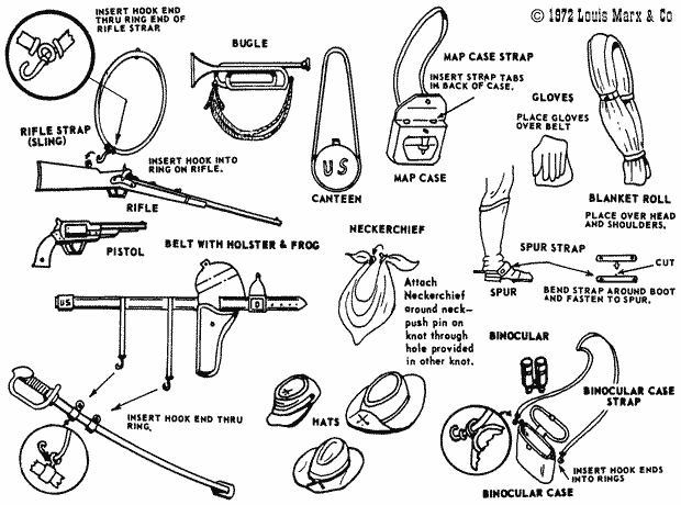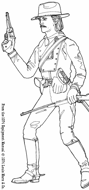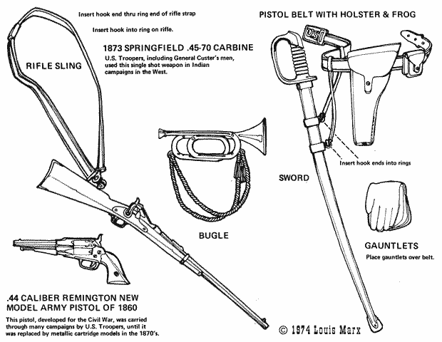 From 1974 Equipment ManualWhen the 7th Cavalry was organized in 1866, Brevet Major General George Armstrong Custer was assigned as its Liutenant Colonel. During the Civil War, he was the youngest officer to become a commanding general. He distinguished himself in many campaigns as a fine leader. He was a flashy person, designing and wearing his own uniforms and was noted for his long blond hair. In 1876, he, along with companies C, E, F, I, and L, of the Seventh were defeated by the Souix Indians n the Little Big Horn. |