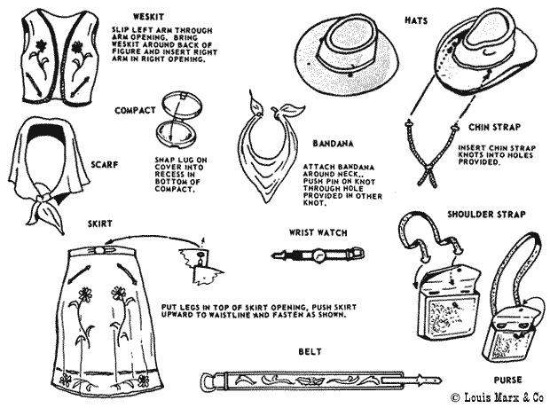 From 1960's Equipment ManualThe cowgirl has been completely outfitted with the equipment and clothing listed - - Everything necessary for her life on the western range! Follow the diretions for assembling the equipment, then have fun outfitting the cowgirl with her various outfits. |